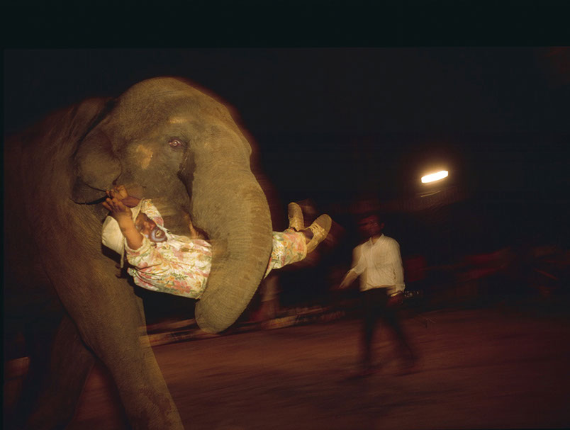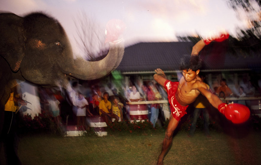 Thailand. There is a fascination with elephants in the Thai culture and religions. But, in a country that is modernizing there is no longer a place for elephants. The circus find ways to use the animal to entertain. Here the crowd is challenged to BOX an elephant... and this is the outcome. The elephant sends the often drunk challenger flying through the air.